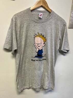 This original 90s graphic tee features a classic Calvin character illustration with 'Bad to the Bone' script. Printed on a grey heather Jerzees tag, this shirt captures the quintessential aesthetic of early 90s streetwear and parody pop culture.