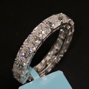 💎 The step-cut stones give off a sophisticated, high-end shine (more of a glassy, elegant sparkle vs. flashy brilliance). Looks very similar to high-end emerald-cut diamond bands.