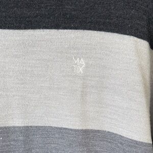 Lightweight knit crewneck with wide horizontal stripes from Matix by Marc Johnson. Soft, smooth texture for easy layering. Various grays and mustard color bands. Subtle embroidered logo at chest. Versatile casual staple for everyday wear.