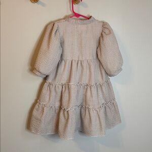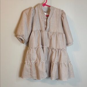Soft cream and white striped dress with a tiered skirt for playful movement. Lightweight cotton blend fabric keeps her comfortable all day. Button-front detail adds classic charm. Puff sleeves and a relaxed fit for easy wear. Gently used. Mild signs of wear maybe. Plenty of life left!!