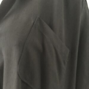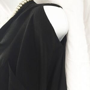 Elegant Black Rayon and Viscose modernist design Long Sleeve blouse. This has a front cross over fold with a snap to keep it closed, shirt tail rounded back with a yoke, the front has 2 side slanted patch pockets, faux stand up collar, very unusual design..Mint condition new with tags, "Linear front fold Blouse." This does not photograph well as it is oversized and needs a real body to drape over.
