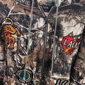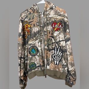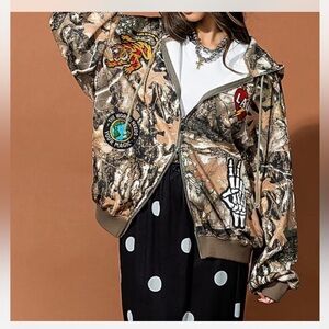 Casual zip-up hooded jacket featuring a brown camouflage print with embroidered patches. Comfortable relaxed fit with ribbed cuffs and hem. Versatile layering piece that adds edge to everyday looks. Easy-care fabric for everyday wear.