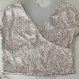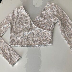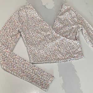 Soft wrap-style long sleeve crop top in white with a delicate pink and brown ditsy floral print. Lightweight, stretchy fabric for comfortable all-day wear. Flattering V-neckline and fitted silhouette for a modern look. Perfect for pairing with high-waist jeans or skirts.