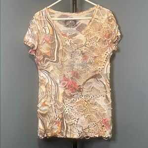 V Cristina sheer distressed short sleeve V-neck top in a beige multi abstract swirl print. Soft, slightly ruched sleeves and a subtle textured pattern. Features scattered floral accents for added detail. Easy to pair for casual or dressy looks. PTP measurements approximately 20 laying flat stretch to 24, length from shoulder to hem is approximately 30. Bundle up for great deals
