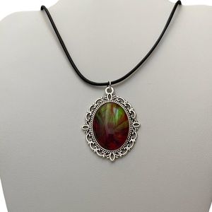 Hand Crafted fluid art pendant cord necklace in neon green and pink. The oval shaped pendant was made by dipping the glass cabochon into acrylic pouring paints resulting in a one of a kind design.