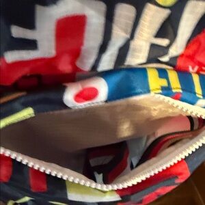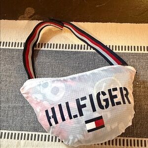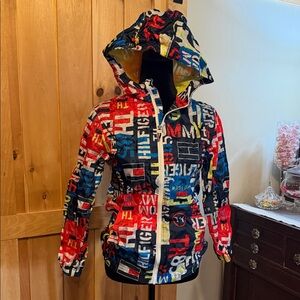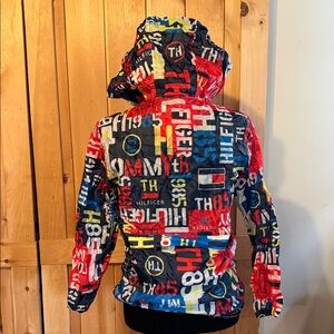 Bold all-over logo print in mixed colors. Hooded design with full front zipper. Lightweight sporty style with vibrant panels. Casual statement piece from Tommy Hilfiger.