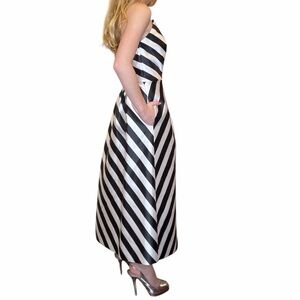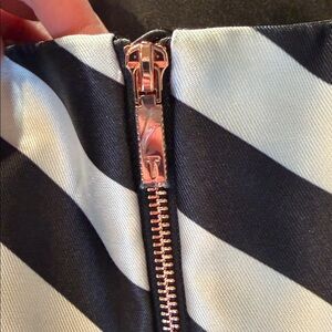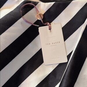 Ted Baker Frieda Dress Size 0 (fits extremely small-see notes below) White and black diagonal stripe Pleated to add shape and design detail Has pockets Would make a great prom or graduation dress. It was sold to me as NWTS, however, the tag arrived unattached and I also can’t sell this as “new”. While it still has wrapping on the zipper, tags are not attached and there are a few flaws. There is one faint snag across the chest. One faint mark which will likely come out with some washing, and one more pronounced makeup stain which faces inside, so can’t be seen while worn. *I had my almost 13 year old model this for me as I can’t get it done up. This dress would be best suited for a teenager or very tiny woman. As mentioned, it would make a great prom, grad, senior formal dress.