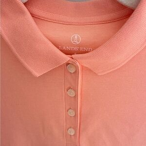 Lands' End women's short-sleeve polo in a soft coral. Button-front and classic polo collar. 100% Pima cotton. Lightweight knit ideal for everyday of golf course wear. Clean, simple silhouette that layers well.
