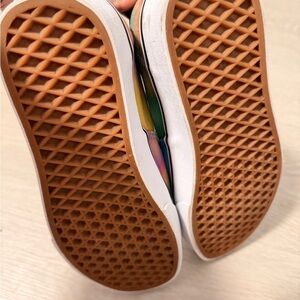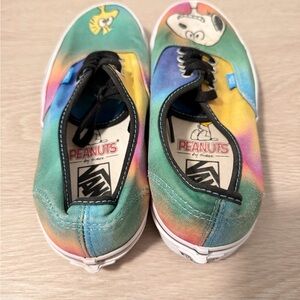 Vans low-top canvas sneakers with bright tie-dye gradient. Features Snoopy and Woodstock artwork on toes. Black laces and white rubber foxing. Casual, playful skate style.