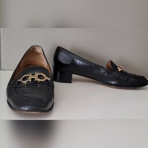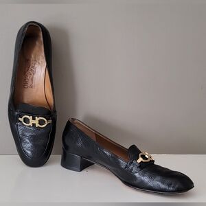 Salvatore Ferragamo Black Leather Heeled Loafers with Gold Hardware
