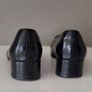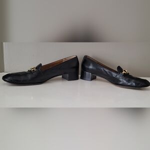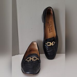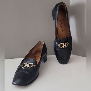 Classic black leather loafers by Salvatore Ferragamo. Gold chainr hardware detail on the vamp. Low block heel. Elegant and timeless style. In excellent vintage condition. Label says Size 7 B but would fit more comfortably someone size 6 to 6.5, in my opinion.