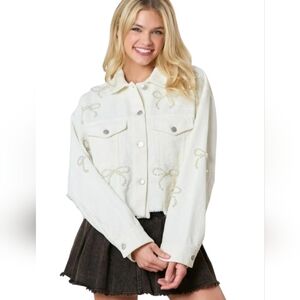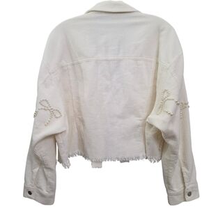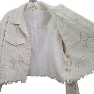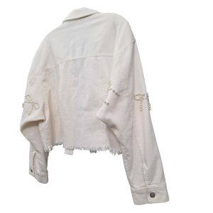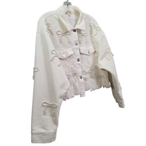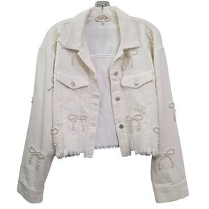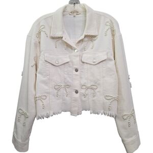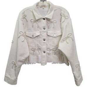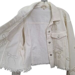 Nwot Peach Love Ivory Cordoroy Pearl Bows Cropped Raw Edge Collared Jacket