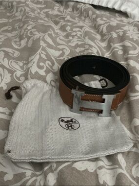 Hermes belt with iconic H buckle. Reversible leather in brown and black. Polished silver-tone H buckle. Classic luxury accessory. Includes Hermes dust pouch.