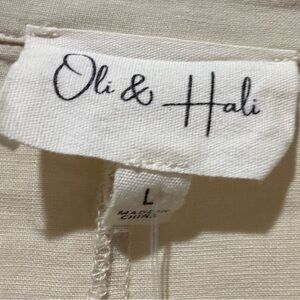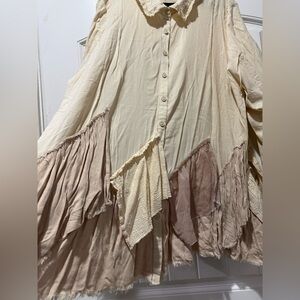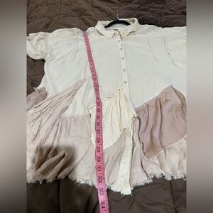 Lightweight cream button-down tunic by Oli & Hali. Panelled tan patchwork hem adds texture. Long sleeves with button cuffs. Relaxed, flowy fit for easy layering.