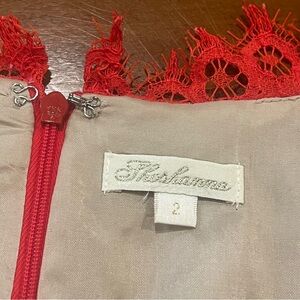 Red lace over nude lining (67.2% Cotton, 18.5% Nylon, 14.3% Rayon). Sleeveless. V-neckline. Hourglass skirt with hidden pockets. Hidden back zipper with hook-and-eye closure. Lined. 34” from shoulder to hem. Imported.