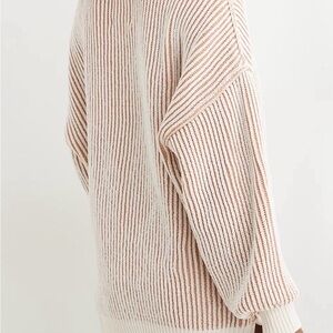 Chunky ribbed knit with cream and light pink stripes. Crew neckline and relaxed long sleeves. Soft, cozy texture ideal for layering. Casual, versatile style for everyday wear.