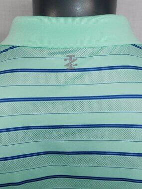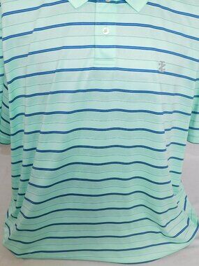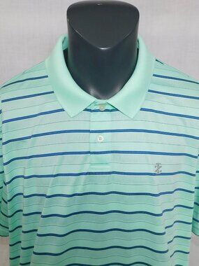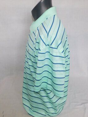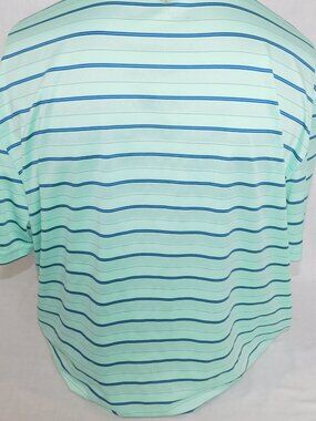 This super fun Men's 2XL / XXL Sea Foam Green Blue striped Polo Shirt is in Excellent clean bright condition. Shirt is 100% Polyester - Machine washable . Shirt is moisture wicking and quick drying.