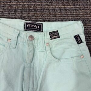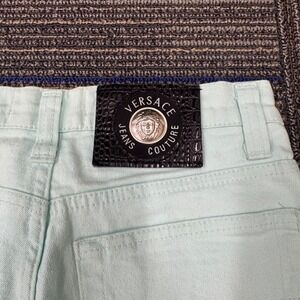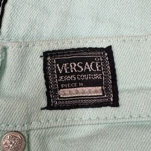 Versace Jeans Couture denim pants in a vibrant mint green wash offer a classic high-waisted silhouette with a tapered leg. Crafted in Italy, these vintage-inspired jeans feature signature logo patches on the front and back waist, along with branded silver-tone hardware for an authentic designer touch. The five-pocket styling and sturdy denim construction provide both functionality and a timeless aesthetic.