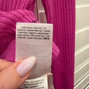 Vibrant magenta-pink ribbed cardigan by Ganni. V-neck silhouette with metal decorative buttons. Lightweight knit with fitted shape. Visible brand tag on front. Extra soft and lightweight wool. Size small. New with tags. No flaws.
