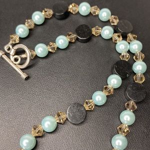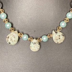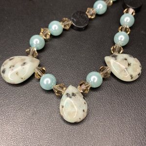 Dalmatian Jasper drops Swarovski crystals and glass pearls. Colors are sea foam blue green, teal, grey and black Sterling toggle clasp. Necklace is 16”