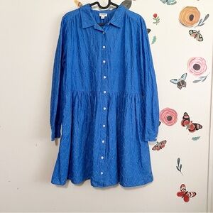 J. Crew Eyelet Blue Long-Sleeve Shirt Dress 10 Vibrant blue shirt dress with long sleeves. Button-front closure and a relaxed, gathered skirt. Lightweight woven fabric with subtle embroidered texture. Functional side pockets. Easy, polished everyday style. Lined and in excellent condition
