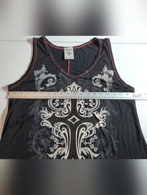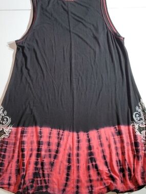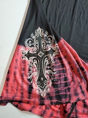 sleeveless tank with a bold white ornamental cross print on a black base. Features a red tie-dye hem for a modern, edgy look. Lightweight and breathable for everyday wear. Pair with jeans or leggings for an easy, stylish outfit.