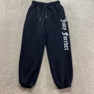 Juicy Couture x Forever 21 collaboration sweatpants in a classic black fleece. These joggers feature a bold "Juicy Forever" graphic in white Old English lettering down the left leg. Designed with a comfortable elastic waistband and drawstring, side pockets, and elasticized cuffs for a tapered fit. The drawstring is detailed with "Juicy Forever" repeating text and finished with metal aglets. This item is in good pre-owned condition with minor signs of wear.