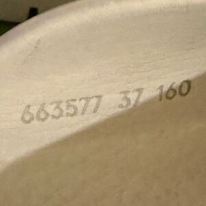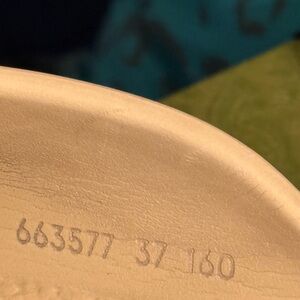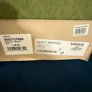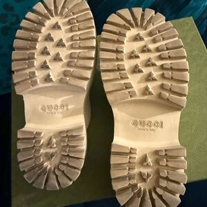 Gucci slip-on clogs with perforated GG logo. Cream leather upper with chunky platform sole. Easy on-and-off mule silhouette. Stylish neutral for everyday wear.