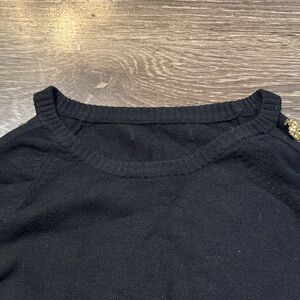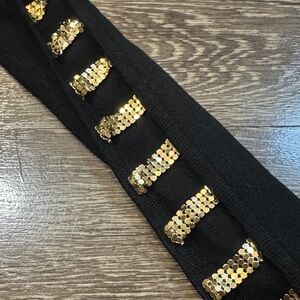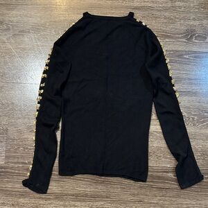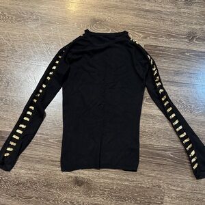 Stylish black long-sleeve knit top featuring metallic gold stripe accents down both sleeves. See photos for sleeve effect once worn. Slim, stretch knit offers a comfortable, flattering fit. Versatile piece that elevates casual and dressier looks alike. No tags or brand available. See photos for condition.
