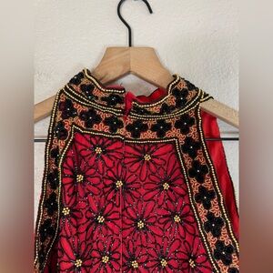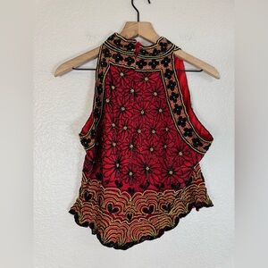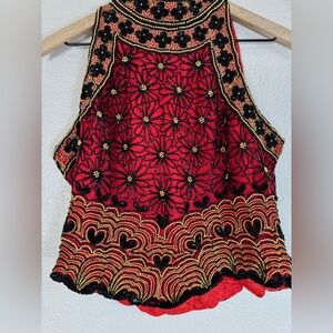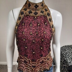Papell Boutique Evening 100% Silk Beaded Sequin Halter Blouse Black Red size L