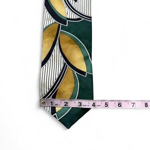 Vintage 90's Green, Gold, and White Patterned Tie. Fun and whimsical bold pattern with a sheen fabric. #90s #colorfultie #mensaccessories #vintagetie #greenandgoldtie