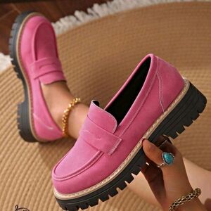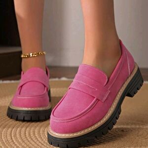 Stylish women's loafers in a vibrant pink suede. Cushioned insole and chunky lug sole for all-day comfort. Versatile design pairs well with casual and dressy looks. Easy slip-on style for quick wear. Pink color adds a bold, fashionable touch. NEW