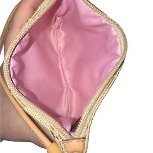 Compact Coach wristlet in khaki signature jacquard. Leather wrist strap and tag. Zip top closure and powder pink sateen interior. In Excellent condition.