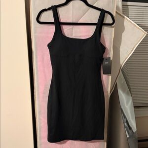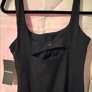 Streamlined black tank dress by Fabletics. Scoop neckline with a front cutout detail. Stretch fabric for a close fit. Subtle logo at chest. Flattering cut out in back , Double lined form fitting . Stunning
