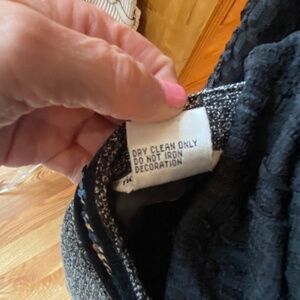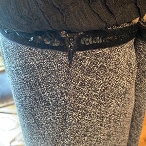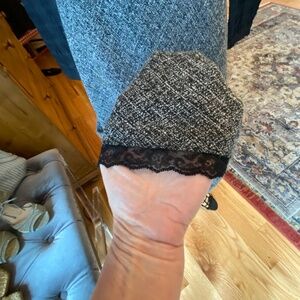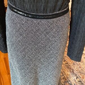 This skirt is very unique, simple and classic. Pair this with boots, a classic white or black blouse, accessories, and you will have a beautiful outfit! Size 10, but I'm an 8 and this fits me fine. Touches of sequin around the waist and lace around the hem of the skirt. Fully lined and midi. (Bin 8)