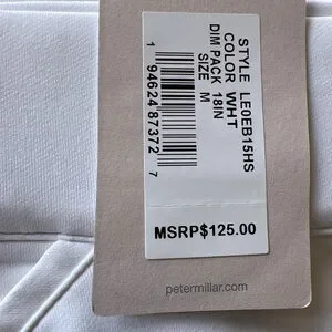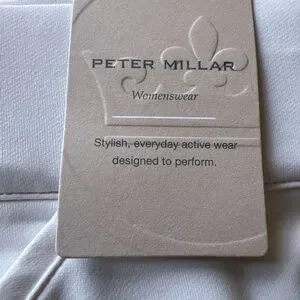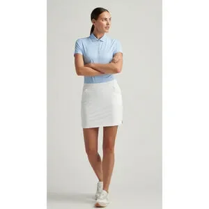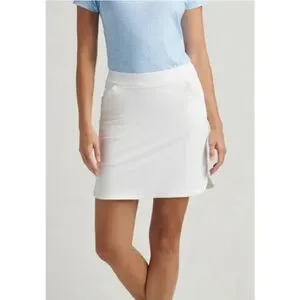 This new with tags Peter Millar women's golf skort is white, size M, and has an 18-inch length. Crafted from a smooth performance fabric, it features a flat waistband, front pockets, and a back pocket with a horizontal opening. The skort presents an A-line silhouette with a curved hem and small side slits, designed for active wear. The original MSRP is $125.00.