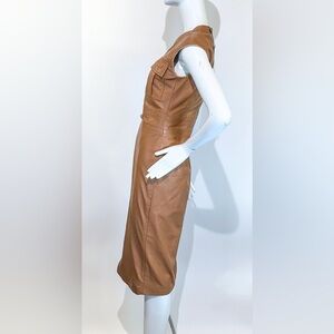 Elevate your wardrobe with our Camel Soft Leather Snaffle Trim Pocket Dress, a stunning midi dress designed for versatility and style.