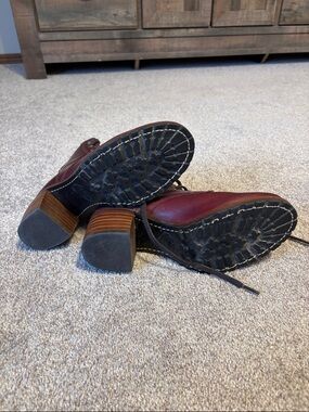 Oxblood leather upper with lace-up front. Metal eyelets and contrast stitching. Stacked wood heel for lift. Durable welted sole construction. Versatile, rugged-chic silhouette.
