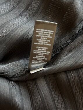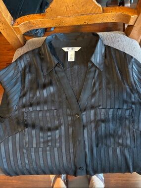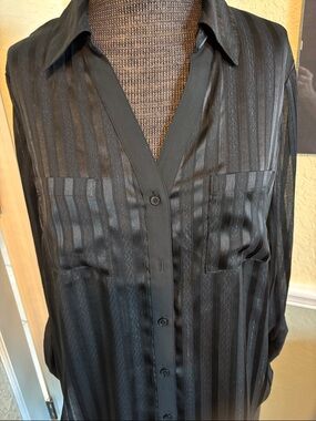 Lightweight sheer blouse with tonal vertical stripes. Classic collar and button-front. Relaxed, flowy silhouette. Stylish wardrobe staple. New without tags the bus is 20 inches. The sleeves are about 25 inches and the length is 24 inches. I suggest a little lace Cami underneath, but it can also be worn with a black bra. Sleeves can be buttoned 3/4.