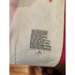 Up for sale is a beautiful vintage pink rain coat from Misty Harbor. This long jacket is made of softshell PVC fabric and features a button closure, long sleeves, and a hood. It is a size 10-petite and has deep pockets for added convenience. This rain coat is perfect for travel and casual occasions, and its preppy and vintage theme makes it a stylish addition to your wardrobe.