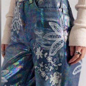 Stylish blue floral wide-leg jeans with an artistic print. Designed for comfortable everyday wear with a relaxed fit. Features a high-rise waist and classic five-pocket styling. Pairs easily with neutral tops for a modern look.