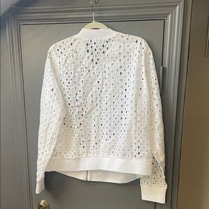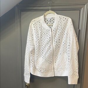 Breezy eyelet bomber with full front zip. Openwork lace pattern for airy layering. Ribbed collar, cuffs and hem for a neat finish. Versatile piece that dresses up casual looks.
