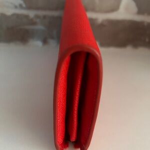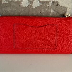 Vibrant red/orange saffiano leather wallet by Coach. Gold-tone logo and zipper hardware. Zip-around closure for secure storage. Sleek profile ideal for daily use.