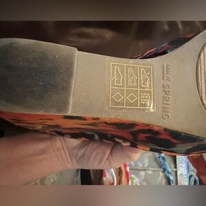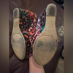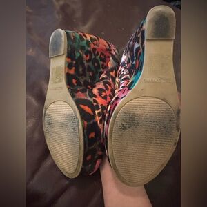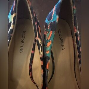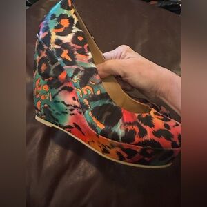 Bold leopard print pumps by Spring. Vibrant orange, pink and teal accents. Classic pump silhouette with a colorful statement. Great for adding flair to outfits.