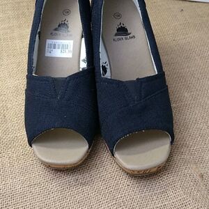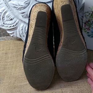 This is a brand new pair of black high heel shoes with sweet looking material, and a cork heel, new with tags. Platform heels. The heel measures three and a half inches high.