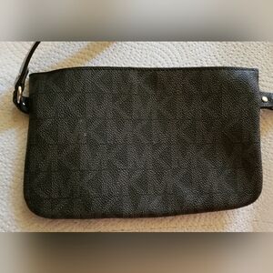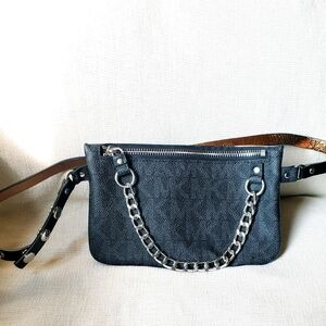 Michael Kors synthetic leather logo fanny pack/ belt bag size medium with logo snaps and pull chain. Belt pat measures APPROXIMATELY 36 inches at largest snap. Bag measures APPROXIMATELY 8 in long, 5.5 high.