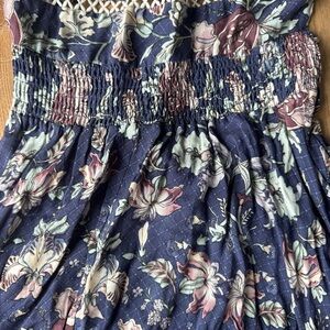 Flowing maxi dress with smocked waist. Spaghetti straps and pleated skirt. All-over floral pattern in soft pink and cream on a navy base. Feminine and easy-to-wear summer style.