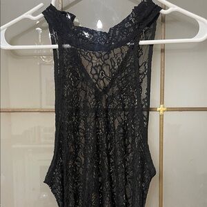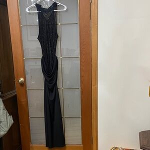 Sleek black evening dress with intricate lace bodice. Backless halter-style top creates an elegant look. Draped skirt adds graceful movement. Refined design for formal occasions.
