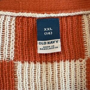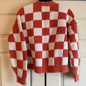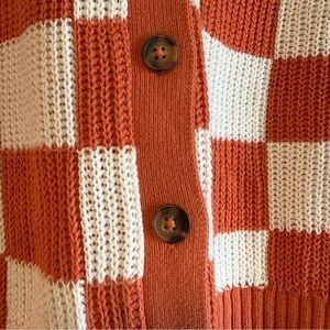 Chunky knit checkerboard cardigan. Button-front closure and ribbed hem and cuffs. Relaxed, slightly boxy silhouette for easy layering.