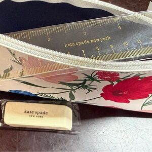 kate spade branded floral zip pencil case. Cream base with pink and blue flower artwork. Gold foil logo on inner ruler accent.